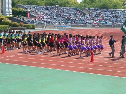 晴天のもと,西京極競技場で行われた開会式。スタンド前へ向かう選手たちの入場行進の様子です。