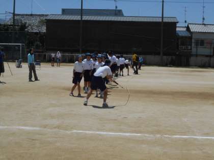 11時30分現在,クラス対抗大縄跳び競技を行っています。クラスみんなで声をかけあって1回でも多く跳ぼうと頑張っています。