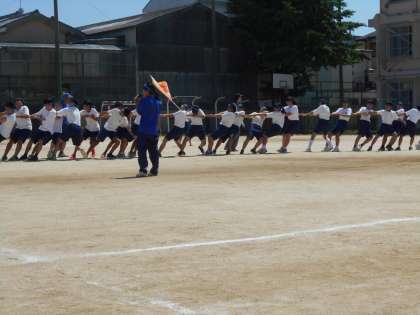 色別対抗綱引きを行っています。次は色別対抗騎馬戦を行います。