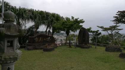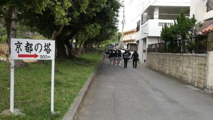バスは予定よりやや早く嘉数台地に到着しました。ここでかつての沖縄戦で亡くなられた方々の慰霊碑「京都の塔」を見学しました。明日午後には,伊江島で「平和セレモニー」を行います。