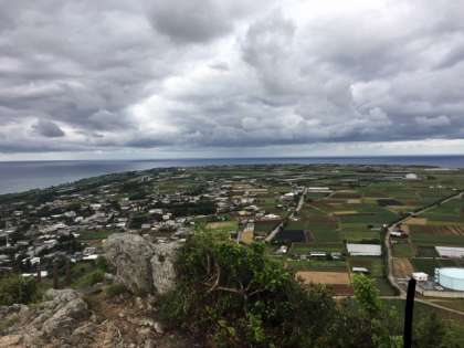 修学旅行は2日目をむかえました。今朝の伊江島の城山(グスク山)からの眺めです。沖縄は曇っていますが,過ごしやすい気候です。風が心地よく吹いています。今日は民泊体験,平和セレモニー,レクリエーションがあります。