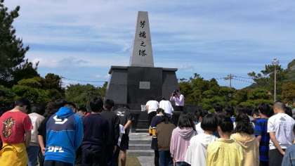芳魂之塔にて「平和セレモニー」を行いました。平和の尊さをかみしめ,平和宣言を読み上げるとともに,持参した千羽鶴を奉納しました。