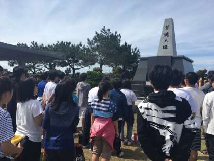 芳魂の塔で平和セレモニーを行いました。そして,千羽鶴を奉納し黙とうを行いました。