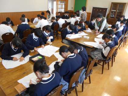 6日(水)2,3限,1年生は「京鹿の子絞」体験を行いました。伝統工芸士の先生がたから説明を受け,2つの教室に分かれて製作を行いました。