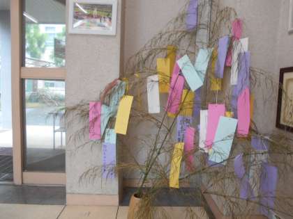 玄関を入ったところと西校舎入口に,笹にみんなの「願い」が書かれた短冊が吊るされています。学習のこと,部活動のこと,将来のこと…様々な「願い」が書かれています。目標を実現させるためにも「チャレンジ精神」をもって日々前進してほしいと思います。