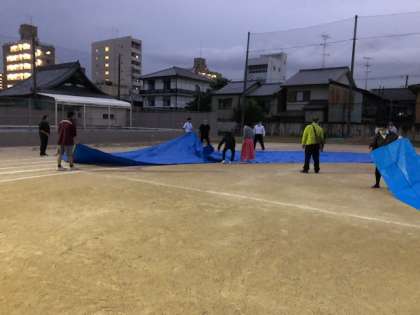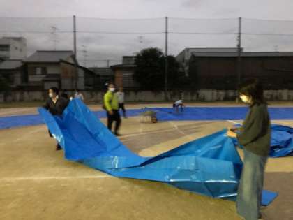 明日は体育大会ですが雨が降る予報がされています。トラックだけはなんとかぐちゃぐちゃにならないように教職員でトラック一面にブルーシートをかけました。何とかできればと考えていますが天候には勝てません。ただし気持ちだけはやる気満々です。