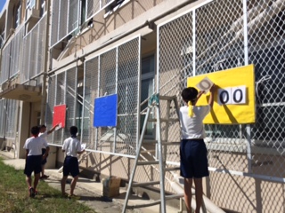 準備から当日の運営まで,さまざまな委員会の生徒が頑張っています。色別得点ボードでも委員会の生徒たちが得点を掲示してくれています。