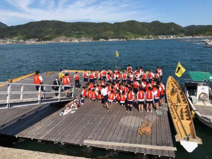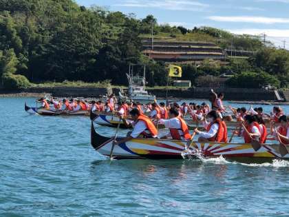午後からは「ペーロン体験」を行いました。ライフジャケットをつけ,力を合わせてこぎました。