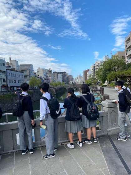 午前は長崎市内の班別研修。各班事前に計画を立てた見学地を訪問しています。写真は「めがね橋」での様子です。