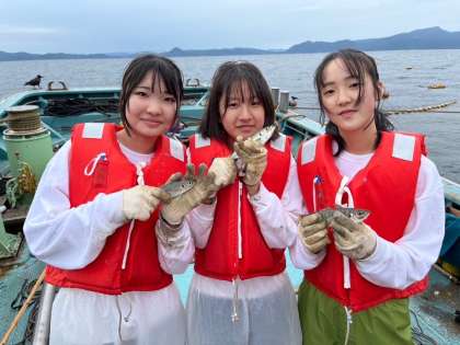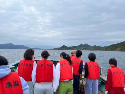 帰港中の船にて。女生徒たちが持っているのは、豆あじ(小さいアジ)ですね。
