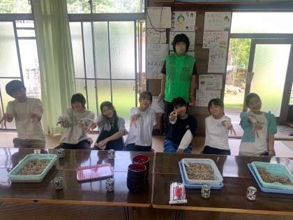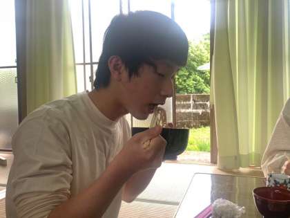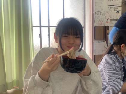 そば作りを終え、自分たちで作ったそばを食べています。美味しいです!