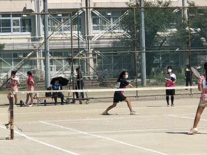 9月16日、松原中学校で、女子ソフトテニス新人戦、団体戦予選リーグが行われました。松原中と春日丘中、八条中の3校での順位決めです。2連勝して、1位で予選通過を目指します。