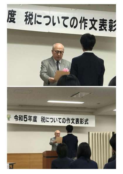 11月28日(火)、中京税務署、京都地方合同庁舎にて税についての作文表彰式がありました。本校からは2作品が選ばれ、2人の生徒が表彰されました。一人目は、「公益社団法人中京納税協会会長賞」を、もう一人は「中京納税貯蓄組合連合会会長賞」をいただきました。