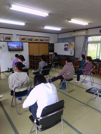 畑でサニーレタスを植えた後、地域の集会所でみなさんと体操を行っています。