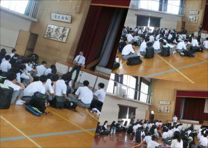 3年生は、明日から九州方面に2泊3日の修学旅行に出かけます。修学旅行に向けて校長先生からのお話や学年の先生からの諸注意などがありました。