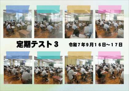 本日より2日間にわたり、全学年で「定期テスト3」を実施しています。各教室では、生徒たちが真剣な表情で問題に取り組む姿が見られ、日頃の学習の成果を発揮しようとする意欲が感じられました。落ち着いた雰囲気の中で、集中して取り組む様子が印象的でした。