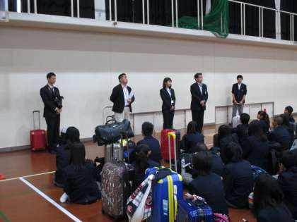 3年生は、朝7時45分に集合し、出発にあたって「結団式」を行いました。これから3日間にわたる修学旅行がスタートしました。