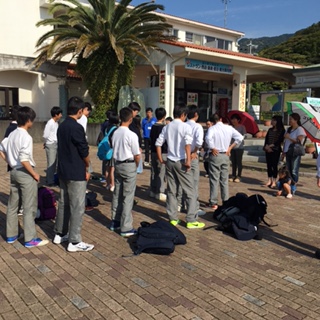 修学旅行は3日目を迎えました。2日間お世話になった民家の方に、感謝してお別れします。次は海の総合文化センターで離村式です。