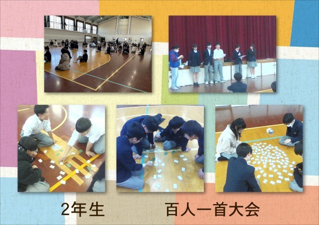 延期となっていた2年生の百人一首大会を、本日無事に実施しました。体育館では、札を取るたびに歓声や悔しがる声が上がり、どの生徒も真剣な表情で取り組んでいました。こうした活動を通して、日本の伝統文化に親しむとともに、クラスの団結力も深まった様子が見られました。