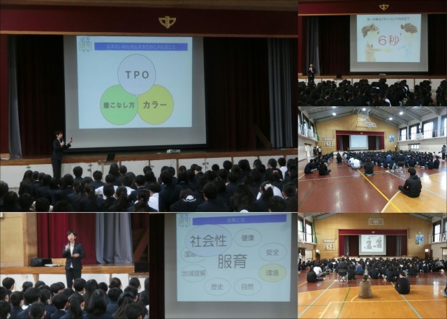 本日、講師をお招きし、「服育」をテーマにした講演が行われました。服装の役割や意味について学ぶとともに、服を通して社会性やマナーの大切さについて、分かりやすくお話しいただきました。生徒たちにとって、日常生活を見つめ直す貴重な機会となりました。