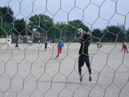 サッカー部の1対1のシュート練習です。対人競技では、相手の裏をかく工夫が必要となります。相手の予想を裏切る=(言い方は悪いですが)だますプレーです。力で押し込むだけでなく、頭を使ってうまく相手をかわす。そんな賢さも身につけてください。