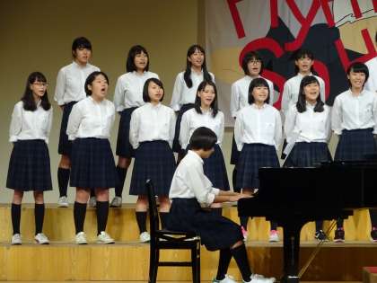 からだを全部使ってタクトを振る指揮者。それに合わせて、より前へ、より高いところへと歌声を届けます。クラスが一つになって、歌をつくる瞬間です。