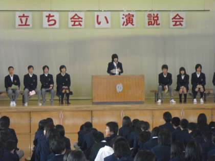 11月12日午後,体育館で生徒会本部役員選挙の立会演説会が開催されました。まず,現本部役員から,本年度前期の取組内容・反省と後期への課題・引継内容が報告されました。