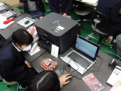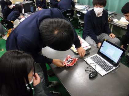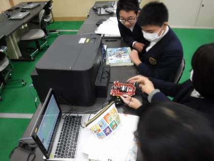 3年生が、技術科でプログラミングに挑戦しています。コンピュータに命令を入力して、ロボットを思った通りに動かしていきます。