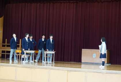 出色のできばえだったのは、各専門委員会の紹介です。どんな場面でどんなふうに活躍するのかを、寸劇仕立てで見せてくれました。けっこうおもしろい場面もあったのですが、そこは1年生も まだ学校生活2日目。反応は堅目でした。けれど、徐々に雰囲気も和んでくるに違いありません。めげずに会場を沸かせることを目指してください。