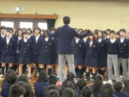 吹奏楽部の演奏に合わせて入場する1年生は、入学式よりもリラックスして見えました。2年生の応援団は、“送る会”を 更にパワーアップ!3年生は、最上級生らしく厚いハーモニーを響かせました。