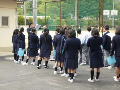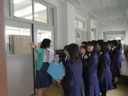 校内を巡りながら、各施設を前にして そこでの約束等の説明を担任の先生から聴きます。小学校とは勝手が違うので、驚きもあったようです。