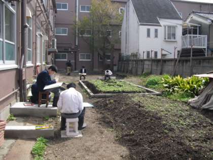 長寿命化工事で新しくなった畑を、そのメンバーがスケッチしていました。ぽかぽか陽気のもと、筆も軽やかに進みそうです。