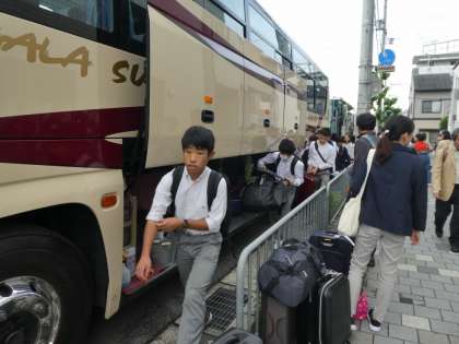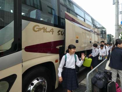 荷物をトランクに積んでそれぞれの座席へ。観光バス2台で新大阪駅に向かいます。きっと車内は、みんなのウキウキ感でいっぱいになっているのでしょう。それでは、行ってらっしゃい!