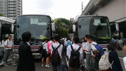 駅前のターミナルから バスに分乗して、一路「知覧特攻平和会館」へ向かいます。みんな、とても元気です。