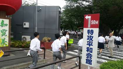 バスが、知覧に着きました。ここから、平和会館横のセレモニー場所へ移動します。