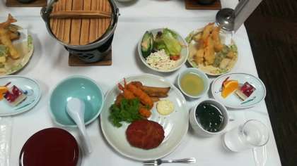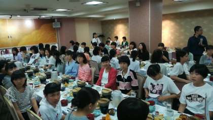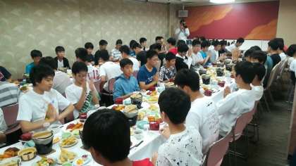 さあ、お待ちかねの夕食です。いっぱい動いて、いっぱい学んで、いっぱい話して、おなかもペコペコです。“同じ釜の飯を食う”という言葉がありますね。膝をつき合わせて食事をすることで、お互いの距離もきっと縮まるはず。しっかり食べてください。「いただきます!」