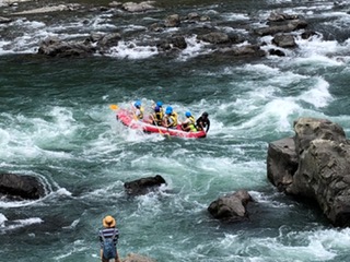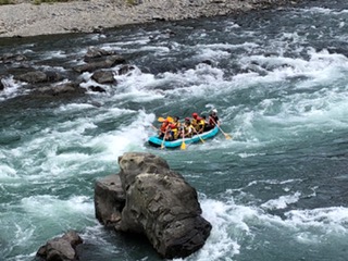 「うお〜!!」「キャー!!」ボートがバウンドするたびに、大きな歓声が…!ラフティングのクライマックスです。
