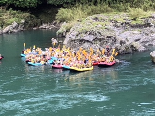 みんなで力を合わせて、急流を乗り切りました。オールを立て、全員の健闘を称えあいます。「イエ〜イ!!」