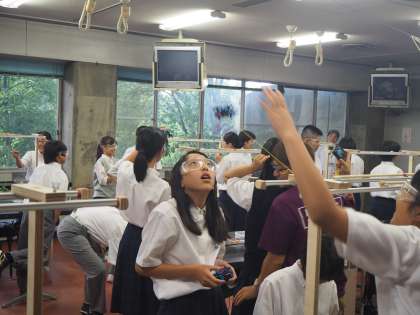 上の写真で「ドローンの科学」に取り組んでいるのは2組。コントローラーで実際にドローンを操作するのが、楽しそうでした。下の写真では、4組が「炎と光」の実験にチャレンジ。ろうそくの炎が発する光を計測して、そのパワーを実感しました。