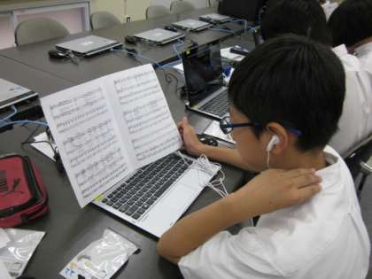 違和感を持つかもしれませんが、けっこう相性は◎です。コンピュータは1人1台の割り当てができるので、自分に必要な部分を何度でも練習することができます。また 両耳イヤホンを使えば、ほかの人の声や音が邪魔になることもありません。