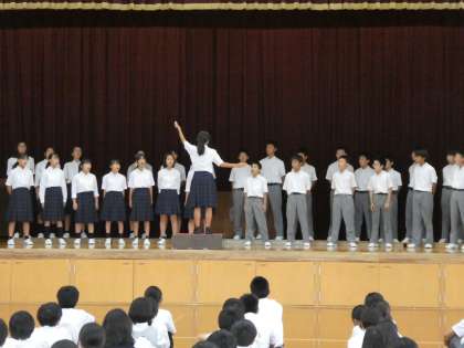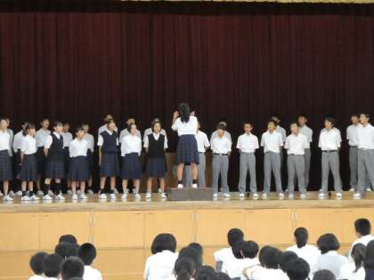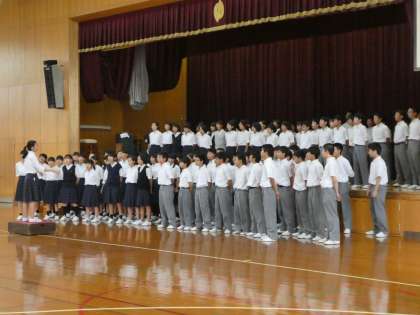 6限の学活の時間、1年生一同が体育館に集まって、それぞれのクラスの選択曲を披露しました。「現段階で合唱が、どこまで仕上がっているか?」お互いの歌を聴きあうことで、いい刺激を受けたようです。その証拠に7限はどのクラスも、目の色を変えてパート練習に励んでいました。