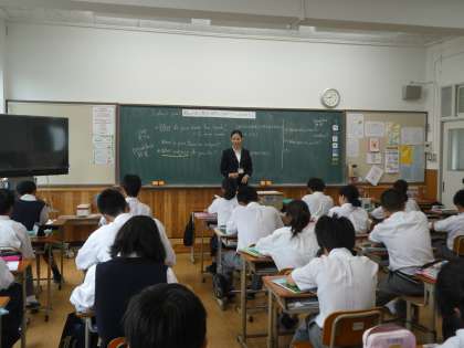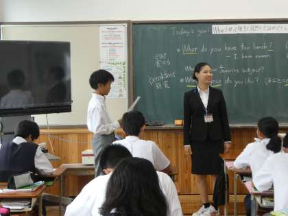 12日(水)1限は、1年生の英語の研究授業です。「“What〜?”を使った文で会話をしよう。」という内容でした。文の作り方を学んだら、あとはインタビュー形式でどんどん話す体験をしました。。