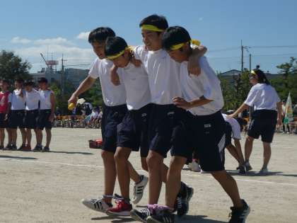 打って変わってレクリエーション競技には、和やかな空気が流れています。上の写真はむかで競走、下は4人5脚リレーです。