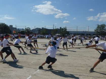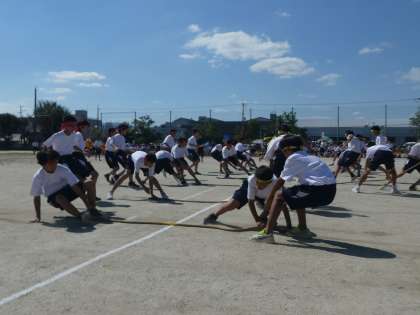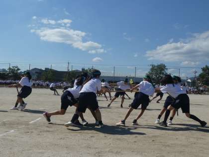 午後最初の競技は、1年生の“GO!!〜未来への大きな1本〜”です。「どの綱をだれがねらうのか?」といった作戦がキモ。素早く綱までたどり着いて、引く!綱を引き込んだら、次の綱へ…。