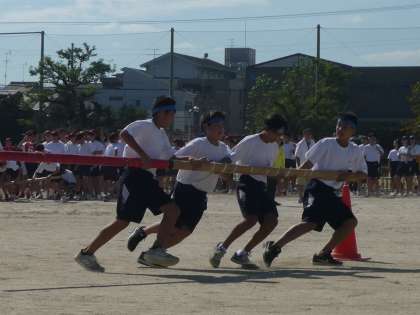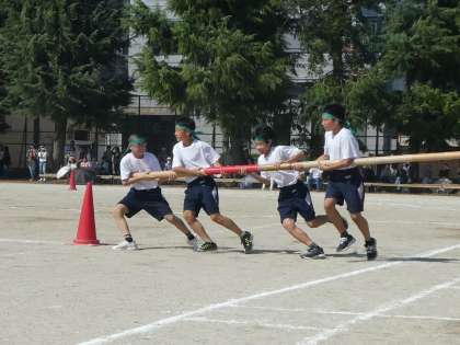 2年生の団体種目は台風の目です。長い棒を持って、コーンを2回転。クラスのメンバーが待つ場所まで走ったら、最初は脚の下を通して後ろ、次は頭の上を通して前へ。