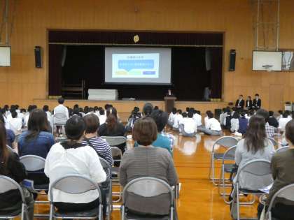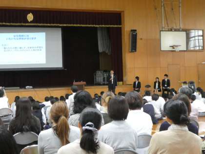 11日(木)、「進路保護者説明会」を開きました。私立高代表として京都国際高校から、公立高代表として朱雀高校から先生をお招きして、私立高・公立高の説明をしていただきました。ここまでは、3年生のみんなも一緒に話を聞きましたね。