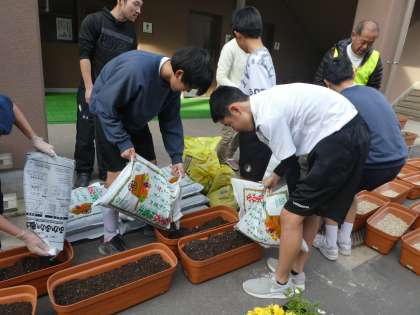 30余りのプランターに、ひゅうが土を敷いたあと 培養土を入れ、一つひとつ苗を植えていきます。100ほどの花が並んだ様子は、まさに圧巻!中庭がぱっと明るくなったように感じました。