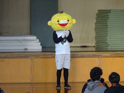 健康観察を終え,予定を少し早めて結団式をスタートさせました。初めに,今回の旅行に同行してくださる添乗員さん,カメラマンさんの紹介がありました。西ノ京中のマスコット「ニシやん」も見送りに駆けつけてくれました。