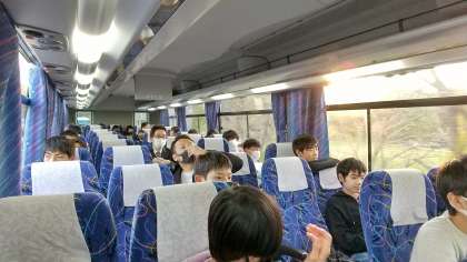 長いバスの旅,バスレクのDVDを準備してくれています。本校のサッカー部生徒とクラブチームでやっている生徒によるPK対決映像,先生がバレーボール部に参加した試合映像を楽しんでいます。