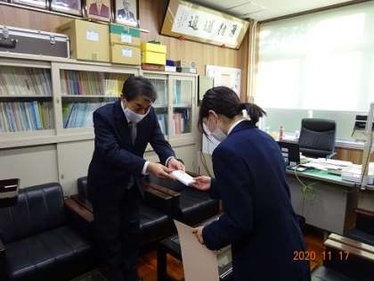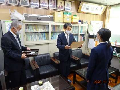 全国納税貯蓄組合連合会主催の「税についての作文」コンクールで,本校3年生の生徒が「会長賞」を受賞しました。11月17日(火),校長室にて表彰式が行われました。おめでとうございます!